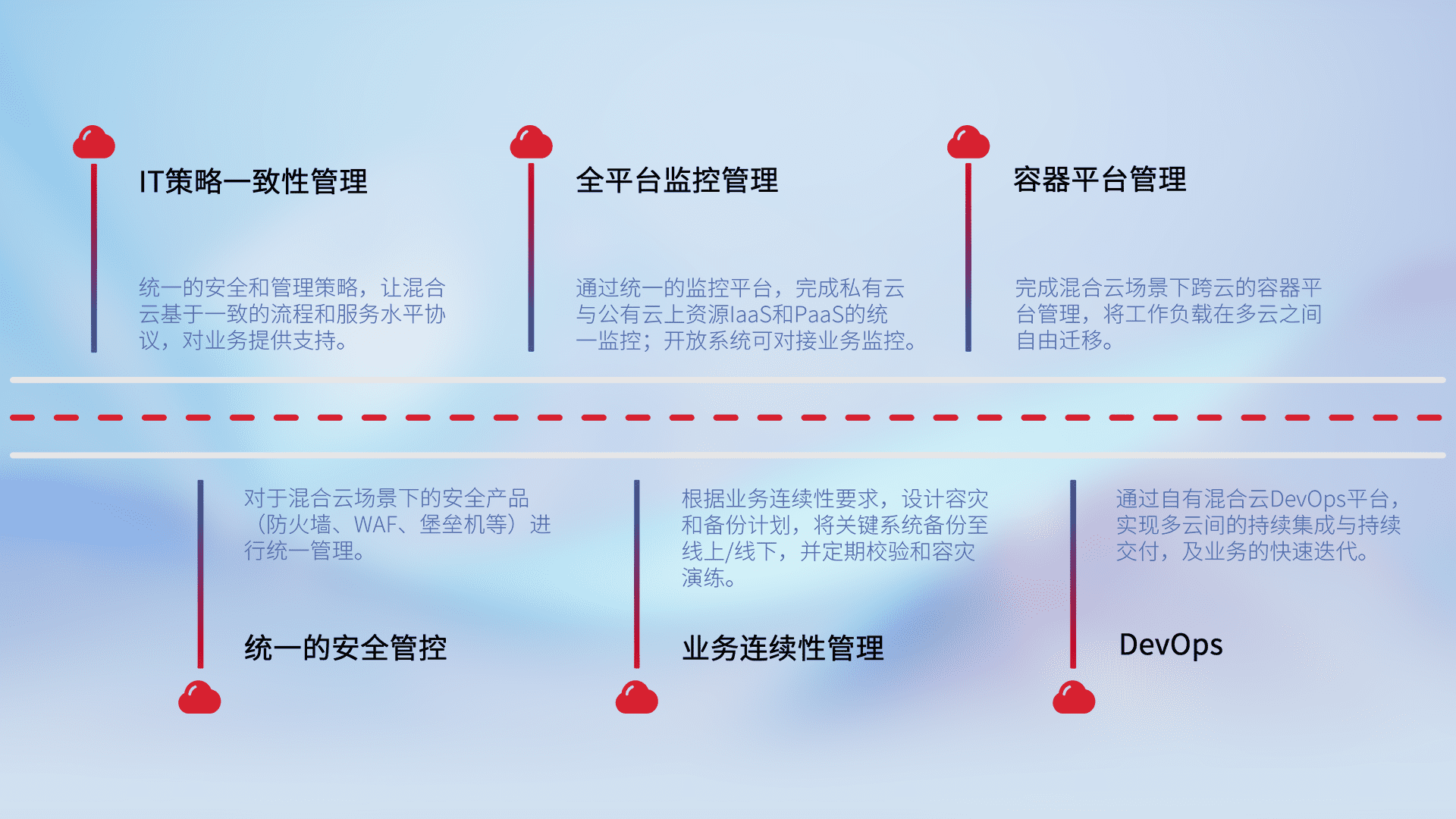 通过多云纳管,,以统一的资源数据模型把客户的云资源进行抽象和封装,,进而实现对多云资源的统一操作,,,,保障云资源管理的可靠性、、、稳定性与可用性。。。。量身定制化运维内容,,配置、、开发运维、、、、补丁管理、、、、备份、、监控、、、、认证和访问管理、、审计和日常巡检等,,保障在用云过程中的可靠度,,,稳定度以及高可用率。。