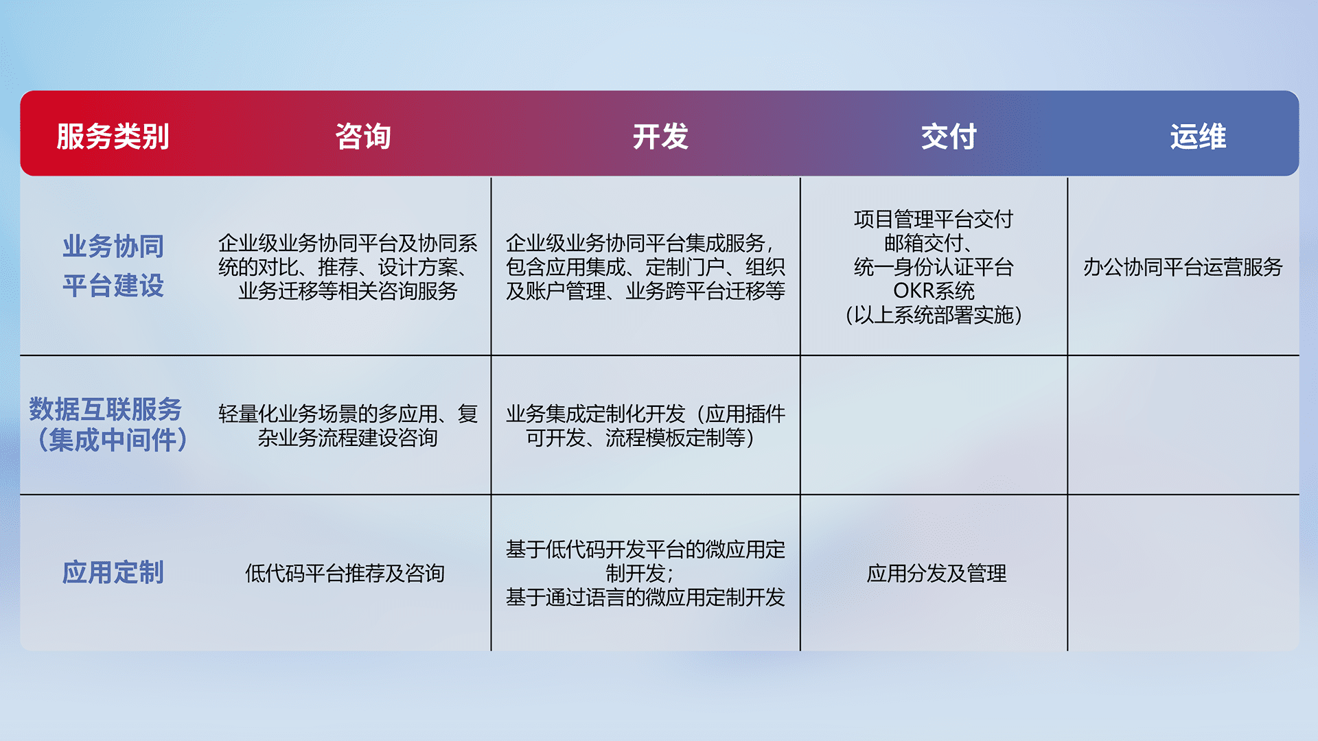 针对钉钉、、、、企微、、、IDaas等平台级产品提供产品的规划、、、方案、、、、交付、、定制化开发等服务,,实现如统一协同办公、、、、智能客户服务、、、混合会议管理、、智能数据查询、、等业务场景,,,实现数字化转型。。。。